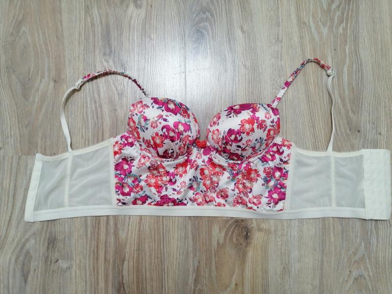 Лиф пуш ап в идеальном состоянии. Носился низ, верх лежал, не носили. Покупался на обьем грудной клетки 92 см с небольшой грудью б. Плотный пуш ап. Ткань атласная, фон не чисто белый, со светло коралловыми разводами. По нему яркие цветы. Не секонд, своя чистая вещь. Ширина под лифом в нерастянутом состоянии 31-35 см, высота через центр лифа 23 см.