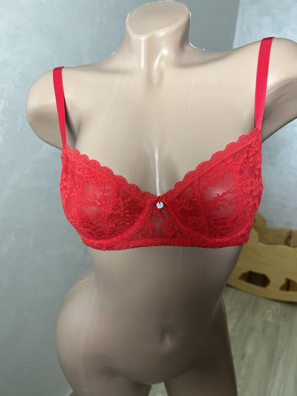 Червоний бюстгальтер бренду Guess. Розмір 70 В. В ідеальному стані. Сітчастий бюстгальтер-балконет без кісточок. Регульовані бретелі. Застібка на гачки ззаду.