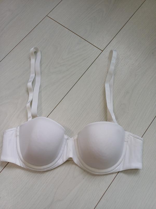 У продажу бюстгальтер від швейцарського бренду білизни Calida, бюстгальтер в білому кольорі, базової гладкої моделі балконет, чашка на кісточках і тонкому поролоні, тиснення бренду на кісточках, верхні ремені знімні, спинка на силіконових смужках, безшовна плоска застібка на крючки. Вся довжина бюстгальтера-61,5см, висота чашки по центру із внутрішньої сторони-10,5см. Стан відмінний Відправка УП, НП, РОзетка