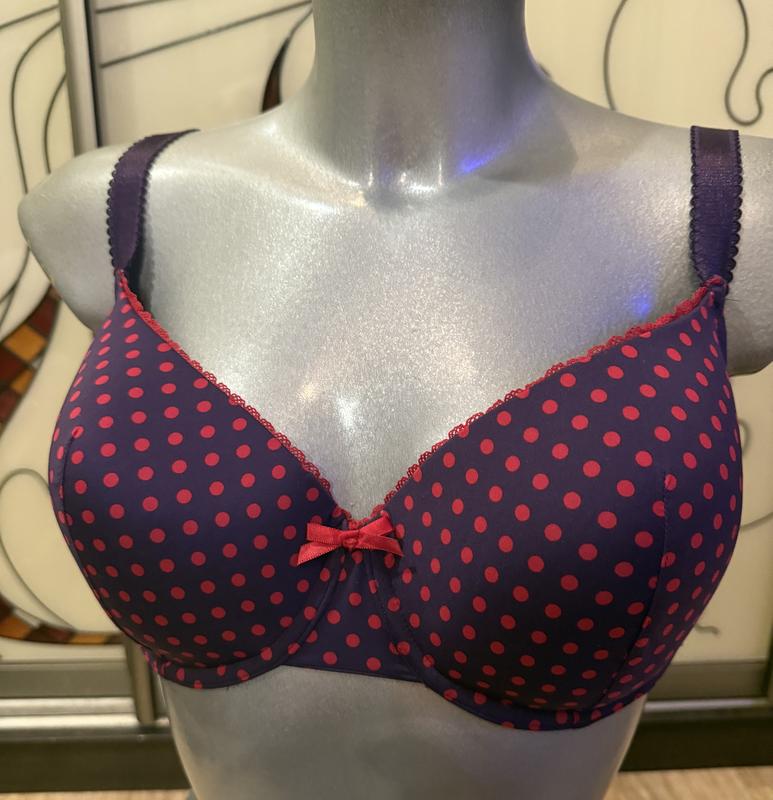Розкішний, базовий, бюстгальтер, в темно фіолетовому, кольорі, в червоний, горошок. Дуже зручний, на кожен день, красиво, і сексуально, виглядає на грудях. Брендовоі фірми: Debenhams. Виробник Бангладеш 🇧🇩. Заміри чашки бюстгальтера: ширина 23 см. довжина 16 см. Розмір вказано: 34E/75E. Склад : 77% поліаміду, 23% еластину. В обхваті, в спокійному стані, 67 см. тянеться до 90 см. Новий без паперової, бірки.