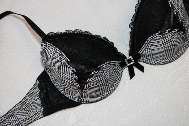 В продаже формованный бюстгальтер со съемным пуш-ап. Гладкая микрофибра в крохотный принт гусиных лапок, цветочное кружево, пикантная шнуровка на чашках, велюровая тесьма на линии декольте и велюровый бант с украшением из стразов создают интересный образ. Бирка срезана, должен подойти на размер 80А (36А), смотрите замеры. Состояние идеал, без признаков носки. К этому бюсту есть трусики, стоимость и дополнительные фото скину в личку.