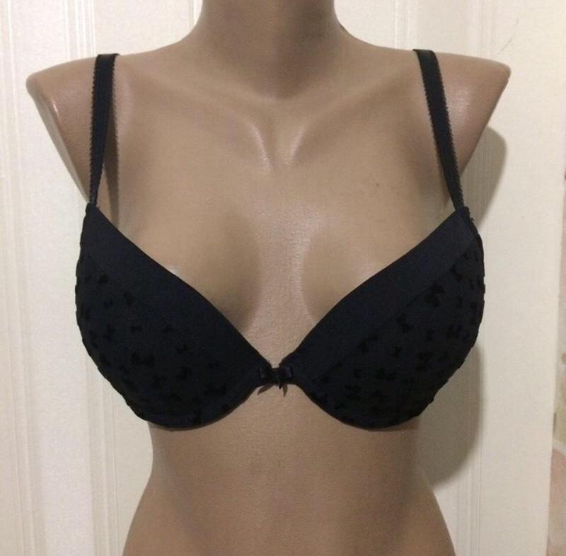 Бюстгальтер черный, узор - бантики(бархатные). Размер указан 80В присутствует ПУШ ап Длина чашки 13 Высота чашки 14 Длина от застежки до застежки в не растянутом виде 69