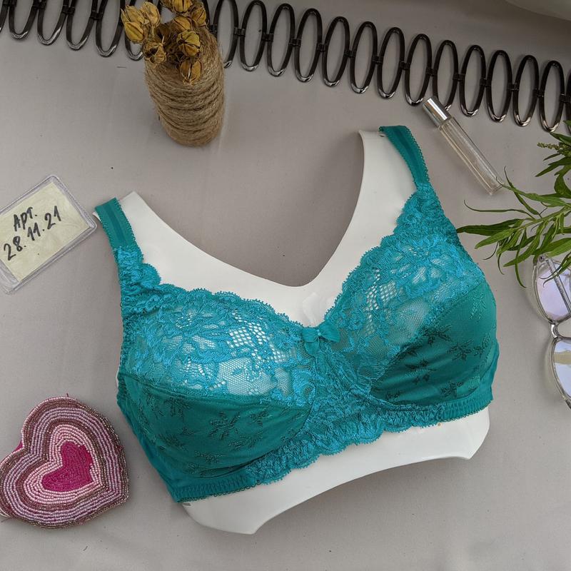 бюстгальтер бирюзовый m&s длина раскрытого 62 тянется до 82 комфортная поддержка без косточек без поролона в груди двойной место для груди по максимальным точкам 17,5 ширина места для груди от шва до шва 18 в одном месте есть незначительные след от липучки . но они внутри . снаружи совершенно незаметно. В целом состояние очень хорошее!