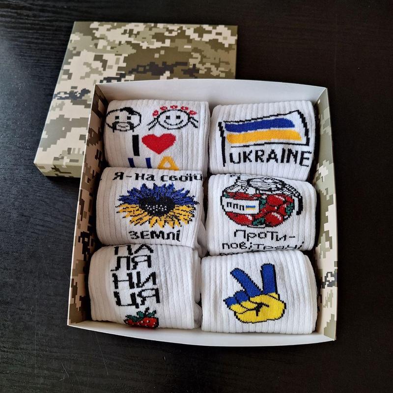 В комплект входить 6 пар шкарпеток та упаковка. - Розмір універсальний 36-41 - Сезон: Літо-Осінь-Весна - Довжина: висока - Преміум якість, гатунок 1 - Малюнок вишивка, не стирається. - Виробник: Україна - Склад: Бавовна 90%; Дорлостан 10%
