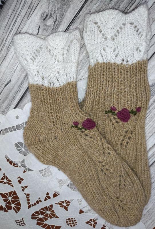 Нежные кружева, тонкая полушерстяная пряжа и элегантные розочки, вышитые в стиле рококо - эти носки самая нежность, ведь чувствовать себя женственно хочется, даже в сложные времена. Эти волшебные носки с ажурной каймой вдохновляют на счастливую, благополучную жизнь настоящей леди)). Красивые женские носки ручной работы станут волшебным подарком для любимой девушки, мамы, сестры, а также это будет необычный подарок для жены! Материал: основная часть - меринос тонкая турецкая полушерсть, верхняя часть отделки - акриловая пряжа с эластаном. Вышивка в стиле рококо. Размер: 38-41 Если вам нужны красивые носки для подарка, то могу предложить аккуратную упаковку и оформление. Красивые носки, женские носки, подарок девушке, оригинальный подарок, подарок жене, подарок маме, подарок на день рождения, подарок сестре, подарок дочке, красивые носки, ажурные носки. Осень уже скоро и теплые носки в ботинки или вязаные носки для дома в этом году будут особенно нужны!! Спешите уже сейчас купить мужские шерстяные носки, теплые женские ночки или вязаные тапочки для дома, а также детские вязаные носки любых размеров. Пишите мне - и я начну уже сегодня вязать вам носки по индивидуальным заказам (размер, цвет, состав пряжи и т.д.) Купить вязаные носки в Украине. Вязаные носки ручной работы. Женские трикотажные носки. Вязаные шерстяные носки. Купить вязаные носки из натуральной шерсти. Мужские трикотажные носки в Украине. Детские трикотажные носки. Толстые вязаные носки для дома. Вязаные тапочки. Теплые носки купить. Вязаные носки Киев. Вязание BONAMI, Носки BONAMI, Митенки BONAMI