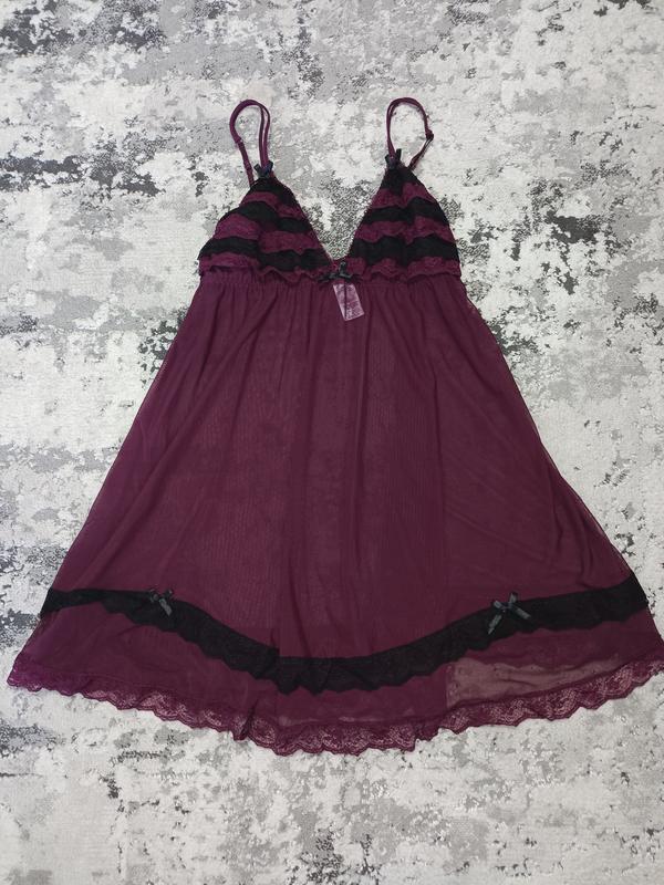Вишневый полупрозрачный пеньюар. Ткань сетка, на груди и по низу - украшен нежным кружевом. Бретели регулируются. Под грудью на резинке. Размер: L, можно на небольшую XL Длина пеньюара 77 см Замеры чашечки: длина - 16 см, ширина - 20 см Полуобхват под грудью 37-49 см Талия и бедра свободны Бренд Janina Стан - идеальный