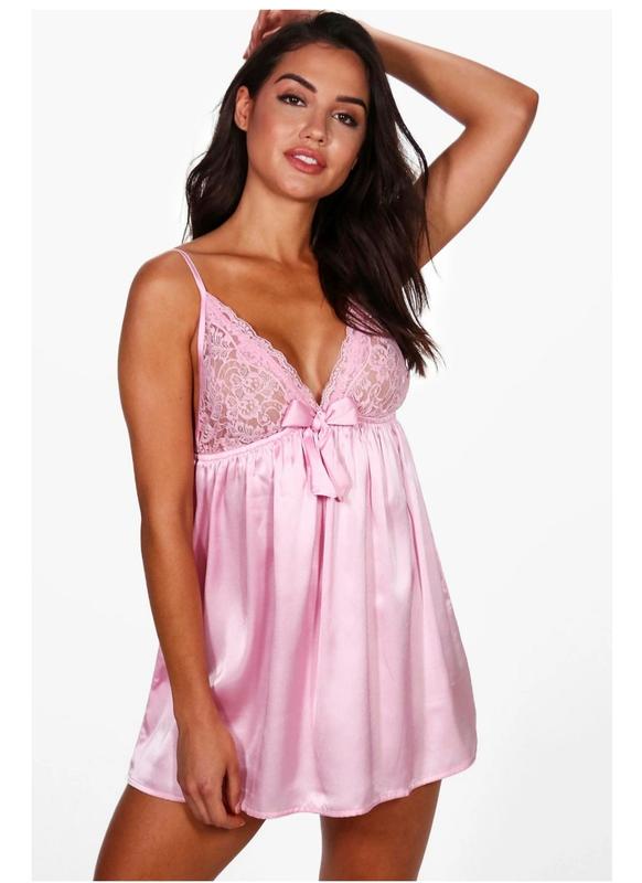 Атласная кружевная комбинация с бантом +трусики. Размер М Пог 30,5 (резинка), длина 64.