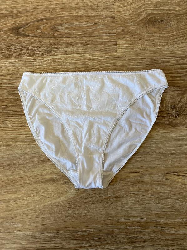 Класні, трусики, котонові, білого кольору. Дуже зручні, на кожен день . Красиво виглядає на фігурі. Брендовоі фірми: M&S. Виробник Камбоджи. Розмір підходить : 12/М. Склад: 91% коттон, 4% полістер, 5% еластину.
