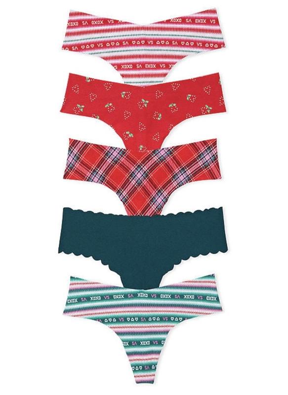 Оригінальний набір з 5 безшовних трусиків стрінгів Victoria’s Secret. Різнокольорові трусики декоровані принтом смужка, клітинка, лого VS. Зручні та непомітні під одягом.
