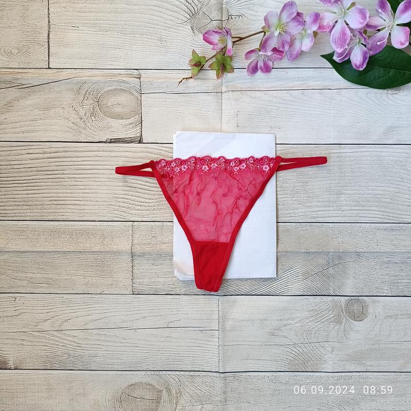 стринги из прозрачного кружева сетки с вышивкой. Бирка срезана. На размер M. ширина 32 см, тягнуться до 44 см висота 19 см.