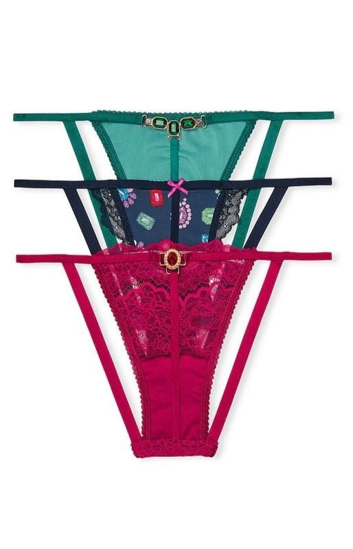 Набор трусиков victoria’s secret 3-pack bejeweled charm v-string panties jewel tones