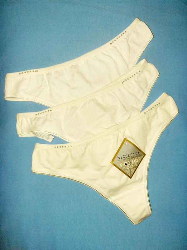 Трикотажные трусики-стринг Nicoletta Турция белого цвета. Склад тканини-на фото. Идет на размер S. Замеры: сверху по резинке-25см, растягиваются до 44см, высота трусиков-18, 5см., сбоку-4см. Цена за 3 единицы вместе Пересылаю после оплаты на мою карточку. После платья и примерок нет,рицательна.