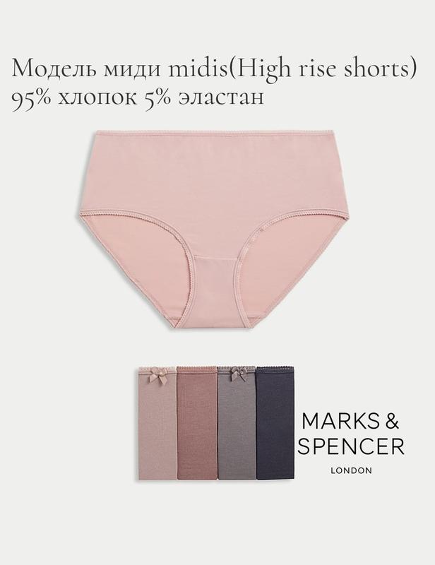 Упаковка (5шт) трусиков меди Marks & Spencer Замеры: Размер 8 (36): рекомендуемый производителем размер бедер 82-90 см (подходит на бедра 90-94 см), полуобхват резинки в спокойном состоянии 28-29 см (тянется до 40 см), высота по центру 23-24 см. Размер 10 (38): производитель рекомендует на бедра 87-95( может подойти на 95-99), полуобхват резинки в нерастянутом состоянии 28 ( тянется до 40), высота по центру 25, высота бокового шва 11-12 см. Размер 12(40): производитель рекомендует на бедра 92-100(може підійти на 100-107 см), полуобхват резинки в нерастянутом состоянии 29-30 ( тянется до 43+), высота по центру 27, высота бокового шва 12-12,5 см. Размер 14(42): производитель рекомендует на бедра 97-105(может подойти на 108-114 см) , полуобхват резинки в нерастянутом состоянии 32 ( тянется до 45+), высота по центру 28. Размер 16(44): рекомендованный производителем обьем бедер 102-110(подходит на бедра 115-120 см), полуобхват резинки в нерастянутом состоянии 32-33 ( тянется до 47+), высота по центру 29, высота бока 13-14 см. Размер 18(46): рекомендованный производителем объем бедер 108-115 см( подойдёт на объем 120-125 см), полуобхват резинки в спокойном состоянии 36-37(тянется до 50 см), высота по центру 29-30 см,высота бока 13-14 см. Размер 20(48): рекомендованный производителем объем 114-121 см( подойдёт на объем 125-130 см), полуобхват резинки в спокойном состоянии 37-38 см( тянется до 55 см), высота по центру 31 см, высота бока 15 см. Размер 22(50): рекомендованеый объем бедер 121-127 см(подойдёт на бедра 130-136 см), полуобхват резинки в спокойном состоянии 40-41 см(тянется до 59 см), высота по центру 32 см, высота бокового шва 15 см. Состав: 95% хлопок, 5% эластан-лайкра® (без каймы); Ластовицы (белья): 100% хлопок.
