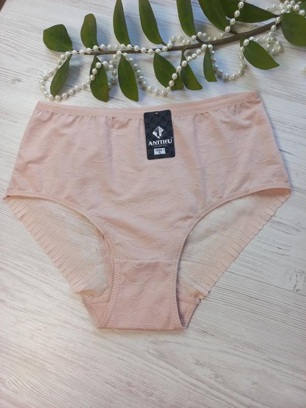 передня частина трусиків виконані з дихаючої тканини з перфораціею, позаду тканина з бавовни в рубчик з оздобленням сіточкою розмір виробника XL орінтуйтесь на заміри: напівобхват резинки по талії 32см. максимально тягнеться до 58см. висота трусиків 31см.