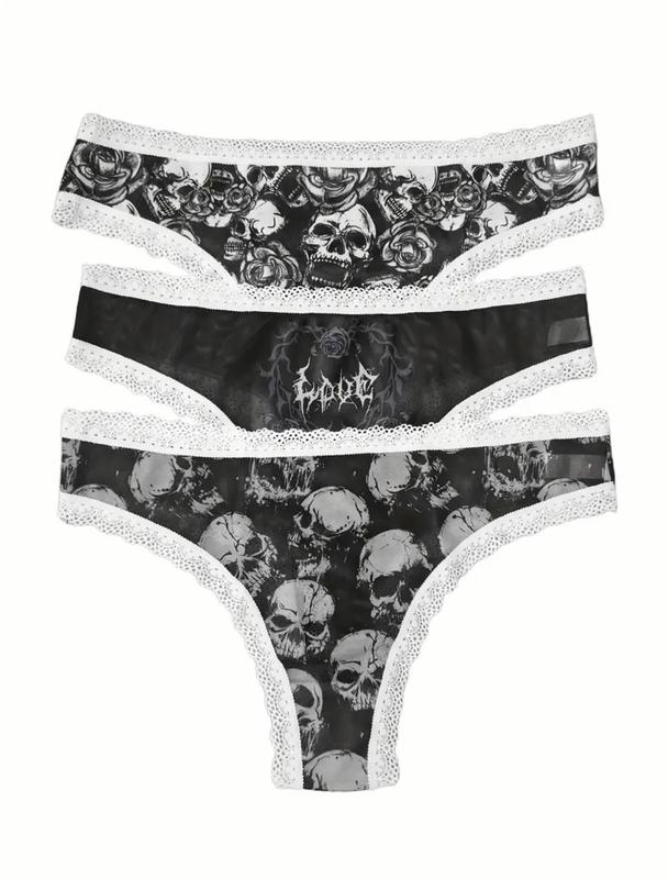 Комплект трусики сітка з принтом череп та троянди. Ластовиця з бавовни. Розмір L