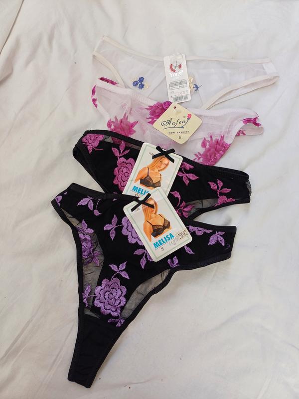 набор из 4 трусиков стринг с высокой посадкой ціна за набір - 280 грн прудаются только набором Трусики новые модель спереди выполнена из сеточки с вышивкой сзади классические стринги размер XS-S (бедра 86-92 см, талия до 65 см)