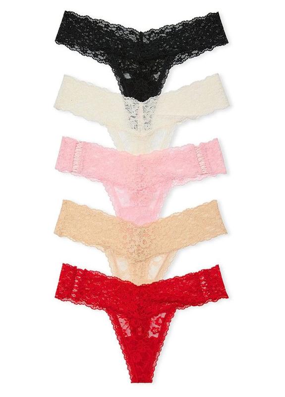 Оригінальний набір з 5 мереживних трусиків стрінгів Victoria’s Secret. Різнокольорові базові трусики декоровані квітковим мереживом, шнурівкою. Зручні та спокусливі.