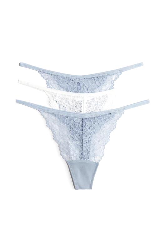 Кружевные стринги. Низкая посадка, тонкие боковины и внутреннее усиление. Ориентировочные замеры: Размер S: полуобхват резинки в спокойном состоянии 30-31 см(тянется до 45 см), высота по центру 19-19,5 см. Количество единиц в упаковке: 3 Талия: Низкая талия Стиль: Трусики-стринги Описание: Светло-голубой/белый, однотонный Состав Внешняя ткань: полиамид 88%, эластан 12% Подкладка в области паха: 100% хлопок