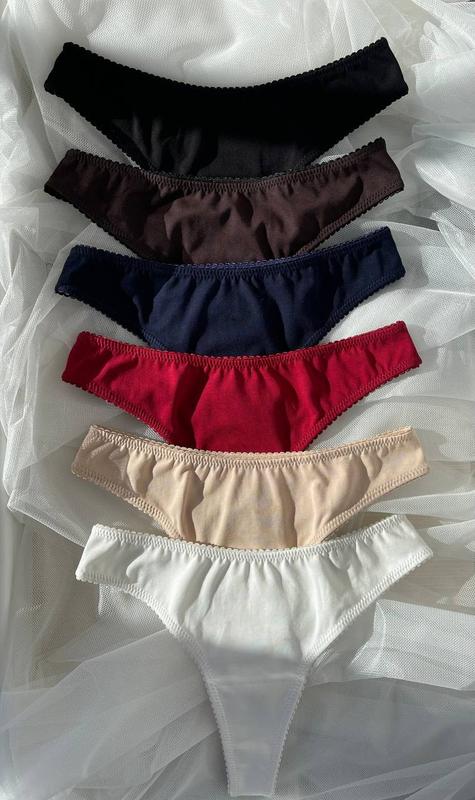 Якісні базові класичні трусики-стрінги у кольорі: чорний, шоколадний, темно-синій, бордовий, беж та молочний. Ціна за 1 шт, ручна робота Трусики виконані із преміальної бавовни і якісної італійської резинки. Трусики чудово носяться, не втрачають кольру та форму. Посадка трусиків середня. ПОБ XS-29 см / S-31 см / M -33 см Висота XS-22 см / S-23 см /M- 24 см Доступні в розмірі: XS, S, M.