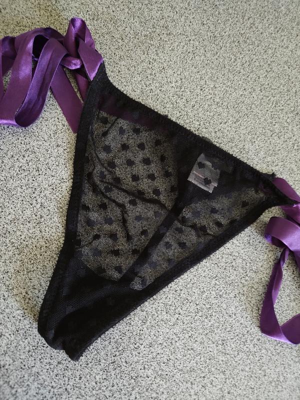 Красивые полупрозрачные трусики с атласными завязочками по бокам от французского бренда La Redoute. Хорошее качество. Высота трусиков 19см. Ширина в поясе регулируются завязками.