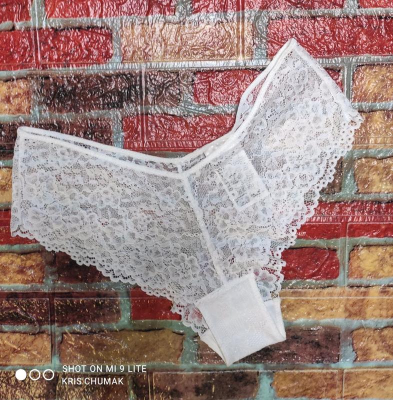 Со всеми вшитыми ярлыками трусики бразилиана кружевные состав 89%полиамид,11% эластан, ластовица 100% хлопок Цвет: белый Размер евро М ВИМІРИ (добре тягнуться) Талия-32(тянется до 47) Глубина-21