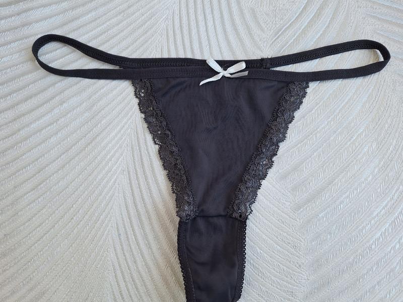 Серые с кружевом трусики танга фирмы No Secret Primark. Размер 10/12 английский (36/12) 38 европейский). Состояние - новый. Замеры в не растянутом виде: ширина - 31 см, высота - 21 cм. Состав - 90% полиамид, 10% эластан. Возвращение нет. Без дефектов.