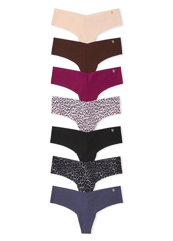Оригінальний набір з 7 безшовних трусиків стрінгів. Різнокольорові трусики декоровані логотипом VS, принтом леопард. Зручні та непомітні під одягом.