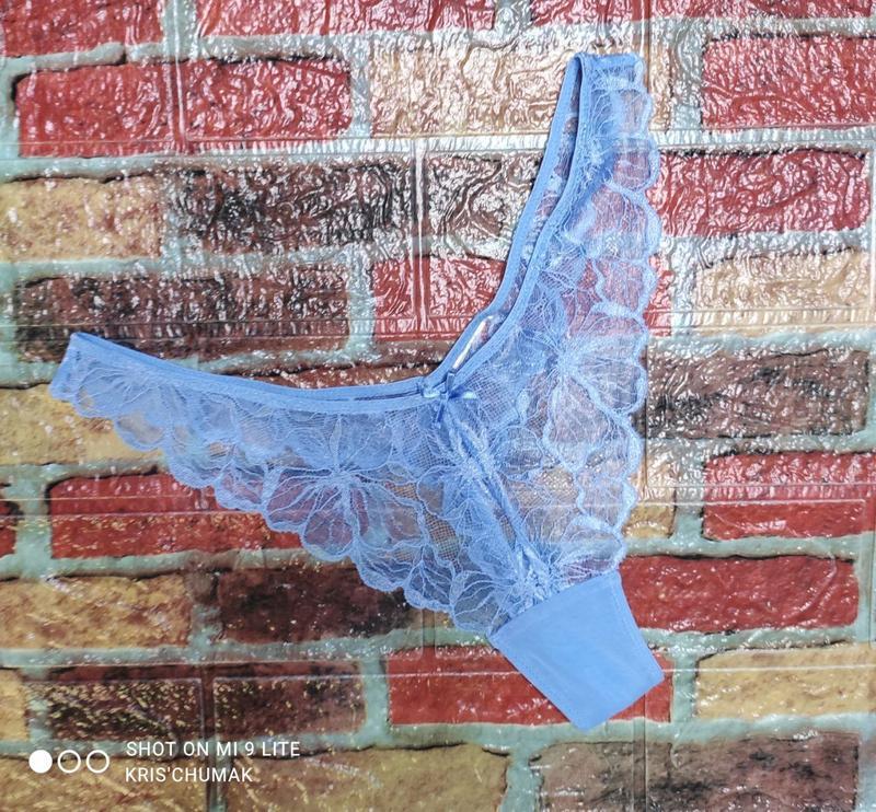 БЕЗ БОРКИ И ЯРЛИКОВ (цена уже с учетом) трусики стринги кружевные ярлык с составом ткани полностью срезанный примерно по ощущению состав полиамид,эластан,ластовица хлопок Цвет: нежно голубой Размер евро около S ВИМІРИ (добре тягнуться) Талия-30(тянется до 44) Глубина-16