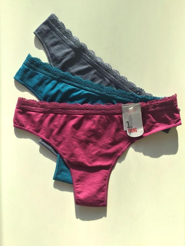 Primark Трусики стринги из микрофибры Декорированы кружевом по поясу Хорошо тянутся Комплект из 3 штук Низкая посадка Размеры: ХS (86-93 см), S (94-99 см), M (100-105 cм), L (106-112 см) 92% полиамид, 8% эластан