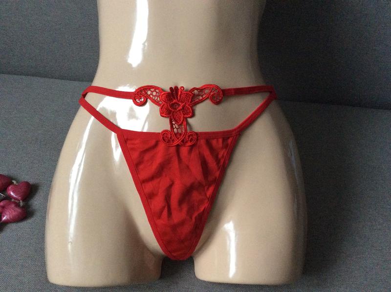 Красные стринги декорированы вышивкой, пояс 60-75, высота 20-22