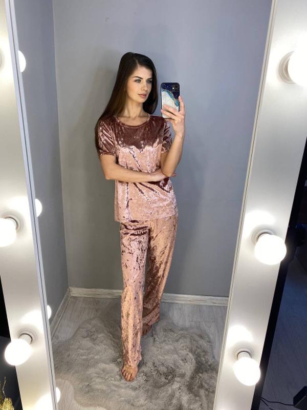 Пижама женская велюровая футболка и брюками, пудра Очень стильная Велюровая пижама ! Пижама женская велюровая футболка и брюками, пудра Цвет пудра! Размеры: 42. 44, 46, 48