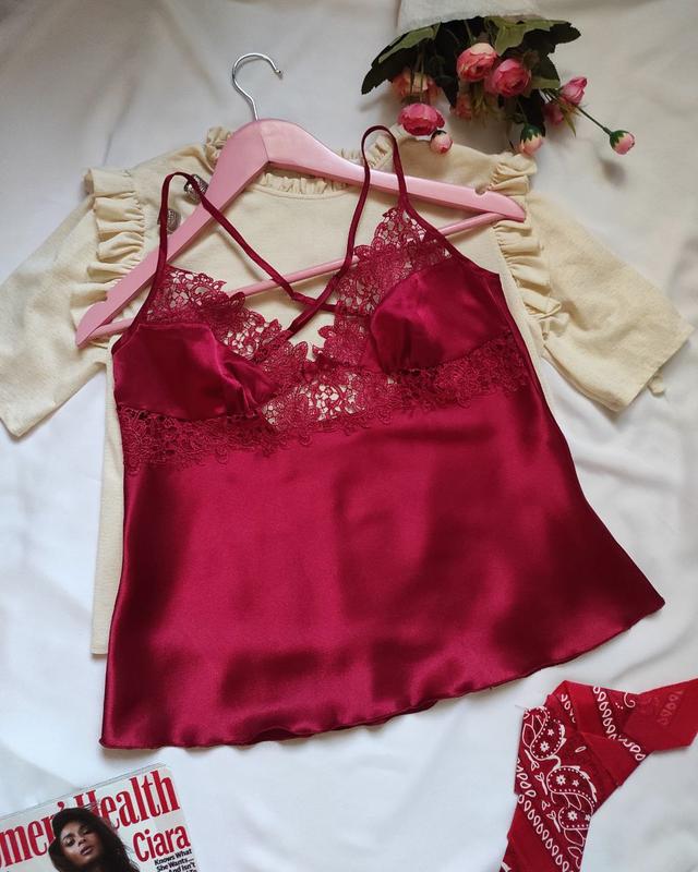 Бордовая атласная майка для сна и дома с кружевом, на тонких бретелях Приятная к телу и удобная Стан - идеальный Размер S