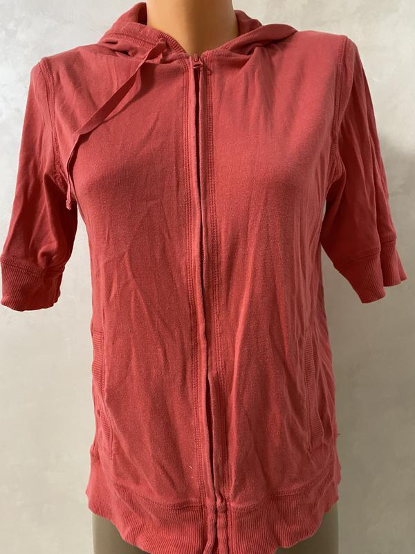 Удобная домашняя кофта на молнию с капюшоном,рукава недлинны поэтому и удобно дома при домашнем трудах/ Подойдет на см л европейский ориентируйтесь по замерам/ Длина 60 см: Плечи 39 см/ Рукав 30 см/ Пог 49 см/ Пот 45 см/ Знизу 58 см/ Из нюансов/на рукаве есть дырочка/оценена недорого/ Продается без возврата/