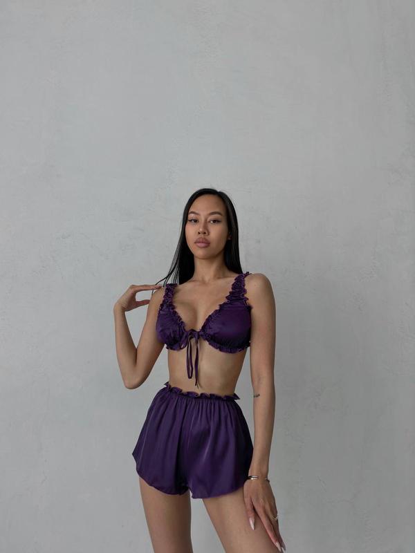 Шелковый комплект «Николь» (Лиф + шорты + трусы )🤍 Арт. #00423 • материал - шёлк Армани • цвет - сливовый • размеры: S, M, L, XL Размерная сетка: S грудь: 82 - 89 см, бедра: 82 - 90 см М груди: 87 - 94 см, бедра 89 - 97 см L грудь: 93 - 100 см, бедра: 96 - 104 см XL грудь: 98- 105 см, бедра: 102 - 109 см