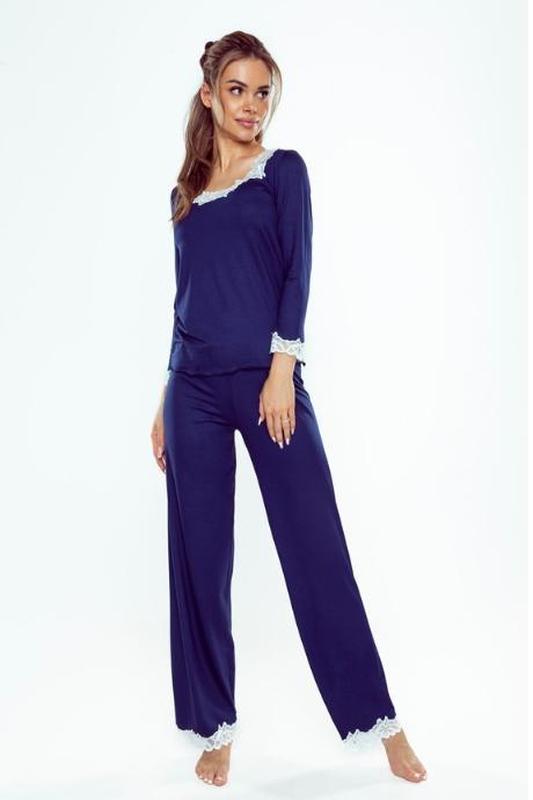 Женская пижама польского производства Комплектация: кофта, брюки. Кофта приталенного силуэта с фигурным низом. Горловина и низ рукава украшен контрастным белым кружевом. Брюки свободного кроя на эластичной резинке. Низ брюк также украшен кружевом. Элегантный комплект сшит из вискозы. Вискоза практичный материал, в котором будет комфортно при любой температуре, в холодное время года - согреет, в жаркую даст прохладу. Дышащий материал, не вызывающий аллергию, подходит для чувствительной кожи. Ткань не электризуется. Состав: Состав: 90% вискоза, 5% полиэстер, 5% эластан. Размеры: S M L XL 2XL 3XL