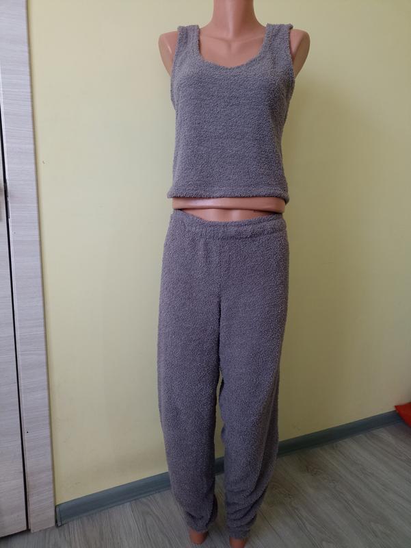 Костюм домашний флисовый, размер L, цвета сиренево дымчатого, серого, брюки ПОТ 44,на резинке тянется до 66 см, ПОС 68 см, глубина посадки 35 см, длина 99 с внешней стороны, 77 см с внутренней стороны, по низу на брюках резинка, майка ПОГ 46, ПОТ 42, длина 50 см