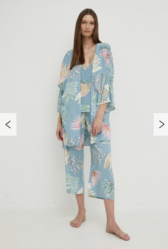 Новий, не носився. 100% віскоза. Майка+брюкі+халат-кімоно. Основний колір блакитно-сірий. Маркований розмір M. Заміри на фото.