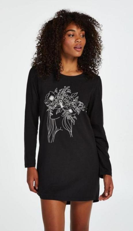 Красива та стильна домашня сукня/туніка або піжама від Hunkemoller в чорному кольорі. Розмір по бірці йде XS-S, можна брати до М включно. Зручна бавовняна сукня з красивим принтом. Заміри: пів обхват по грудях 44 см, довжина 85 см, довжина рукава від плеча 58 см.