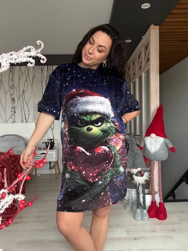 Велюрова сукня-футболка з принтом «грінч», темно-синій колір