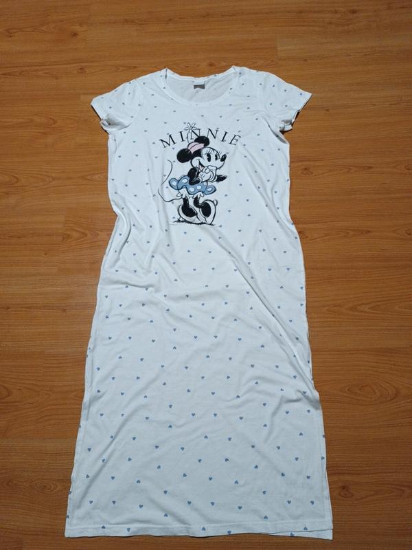 Рубашка женская для дома и сна в идеальном состоянии, без бумажной бирки. Состав 100%котон, белая в голубые сердечки с рисунком Minnie Maus. Замеры: ПОП-42см, ПОГ-54см, длина-125см.