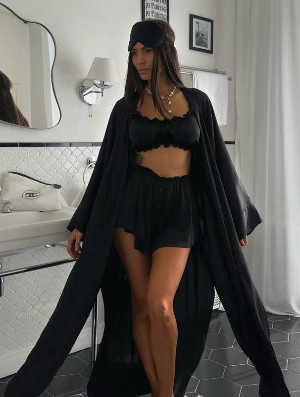 Стиль, который все хотят! 🔥 | Товар не ждёт - TikTok уже сметает с полок! 📩 Подписывайся, чтобы первым получить самые горячие новинки и скидки! 😍 👯♀️ Перешли подруге - она тоже захочет выглядеть на все 100 Подарок, дарящий настроение❤️ Очарование Нового года в одном упаковке🎄 📣Наш ТОП продаж 📣 Домашний комплект 3-ка Халат+шорти+топ ✅Модель 27 ✅Ткань: Армани шелк ✅Размеры: 42-44; 46-48 ✅Цвета: черный, шоколад Нежная тройка для дома или отдыха, сочетающая комфорт и изысканность. Легкая ткань нежно касается тела, создавая ощущение невесомости❤️