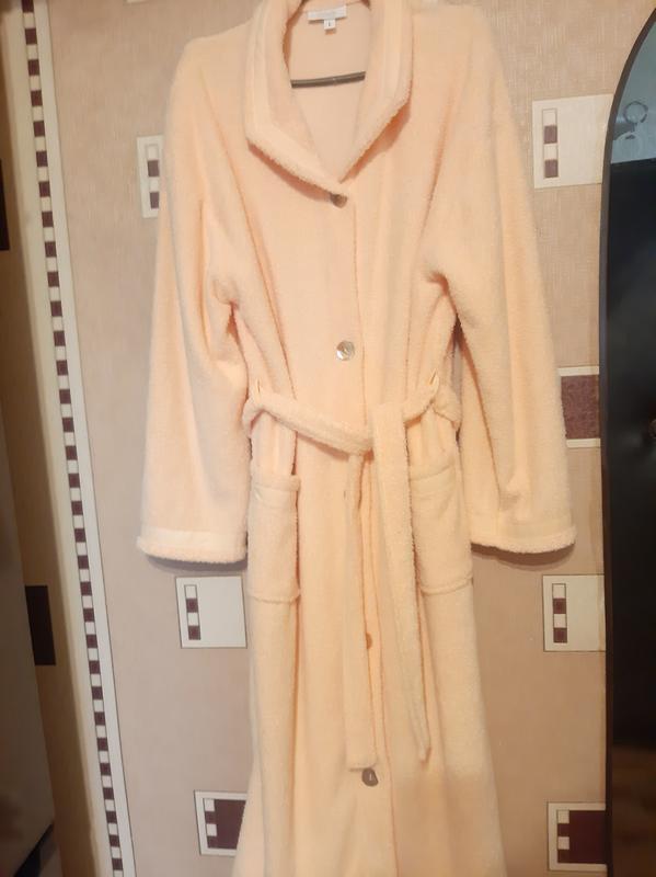 Шикарный халат персикового цвета Длина-125 Ширина в плечах-61 Длина рукава от воротника-74 Ширина под подмышками-62 Размер пишет L (50),но подойдет и на 52