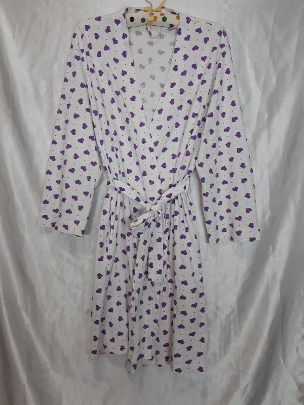 Ідеальний білий хлопковий фіолетовий халат халатик на запах з сердечками серцями короткий...