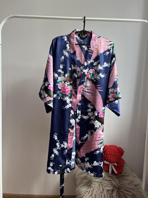 Стильный халат Легкая ткань, приятная к телу Низ на запах , є пасок Плечевой шов приспущен Стан идеален, как новый Замеры длина- 91 П.о.г-55 Рукав от горловины-48 П.о.б-52