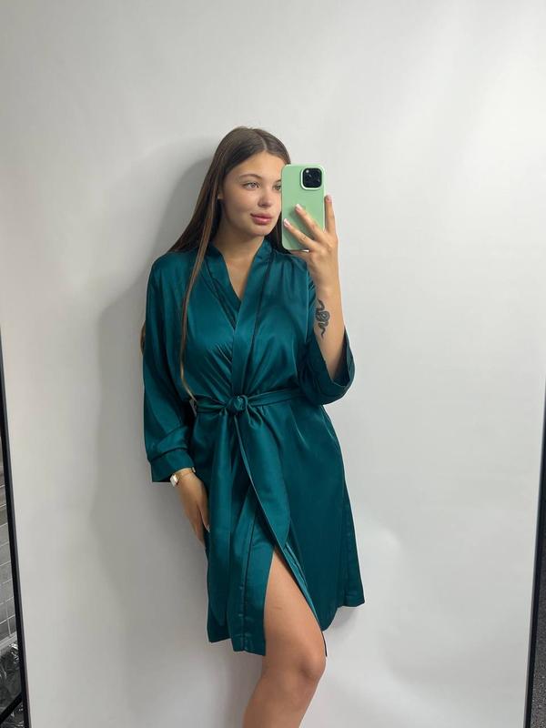 Стильный шелковый халат🌸 Нежный и легкий халатик на запах для дома, украшенный красивыми рукавами с подворотом 😍 Халат идет на запах и фиксируется поясом на бретелях на талии. ✔️Цвет: темная бирюза ✔️Ткань: шелк Армани ✔️Размер: S, M, L На модели размер М
