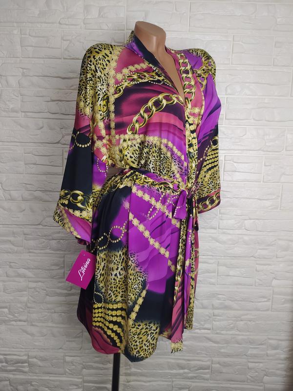 Яркий халатик из приятной на ощупь ткани масло ( холодок). Ткань тянется, не мнется и прохладна к коже. Халатик в одном размере ХЛ. Длина 90 см. В развернутом виде по бедрам 142 см, поэтому подойдет на обьем бедер до 115 см. Рукав 3/4. Приятный к телу, да и выглядит отлично) Приглашаю посетить мою страницу, чтобы просмотреть и другие халатики, пижамы, рубашки. А также Постельное белье из бязи и Ранфорс. Цены умеренные, заходите ответ на все вопросы)