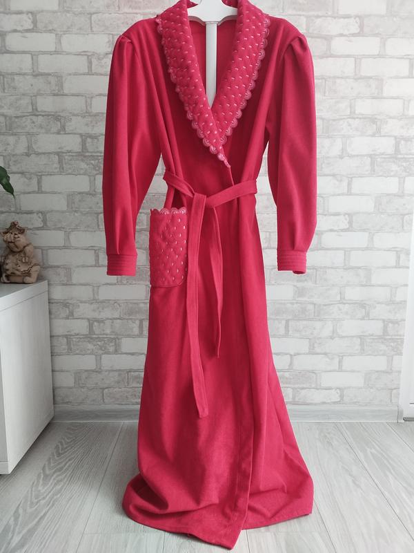 В прекрасном состоянии,тепленький и красивый. Цвет фото не очень передает, он более насыщенный, более яркий. Состав ткани отсутствует,ансируй, что полиэстр. Размер не указан, ориентируйтесь на замеры. плечи 49 см (есть наплечники) рукав от плеча 59 см ПОГ по спине от подмышки до подмышки 59 см ПОС по спине от шва до шва примерно 66 см повна ширина по низу халата 165 см длина по спине от воротничка 137 см воротничок в развернутом виде 11 см