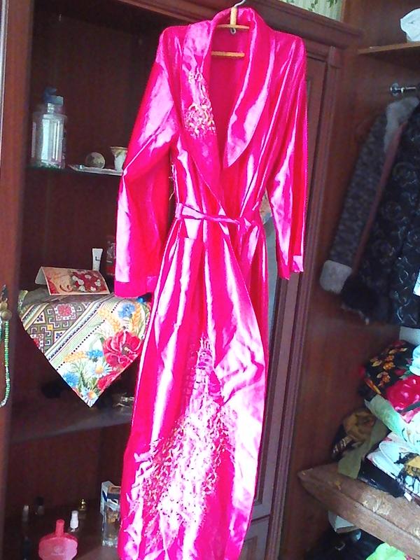 очень красивый, шелковый халат.на запАх.с аппликацией павлина,привезен с Дубая.в хорошем сост.