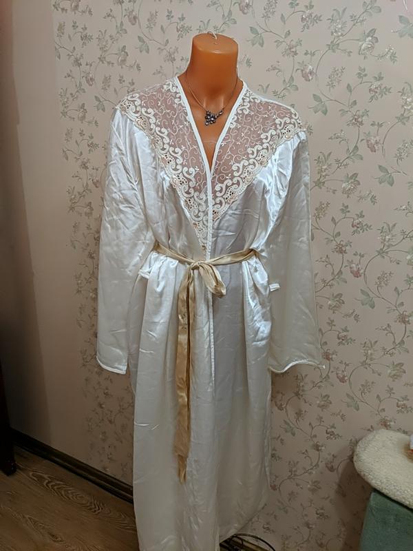 Халат,ткань напоминает шелк, потому что нет бирки.Пояса нет, но он длинный, можно сделать отрезанный на пояс низ.цвет айвори.Моду отдать этот пояс, что на фото, он в цвет кружева