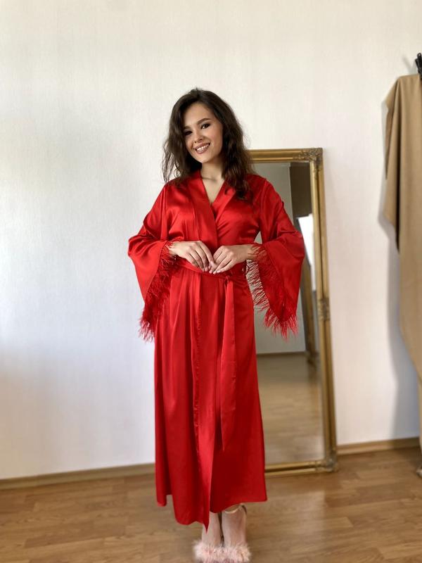 Жіночий халат. тканина шовк Армані. прикрашений страусовим пір'ям, колір чорний. Модель 994-1.довжина до підлоги, під пояс Можливо з сорочкою моделі 122 (продається окремо). Цей халат створений для особливих подій. Він зробить настрій гарним, а вечір незабутнім! Розмір універсальний подвійний S/M та L/XL